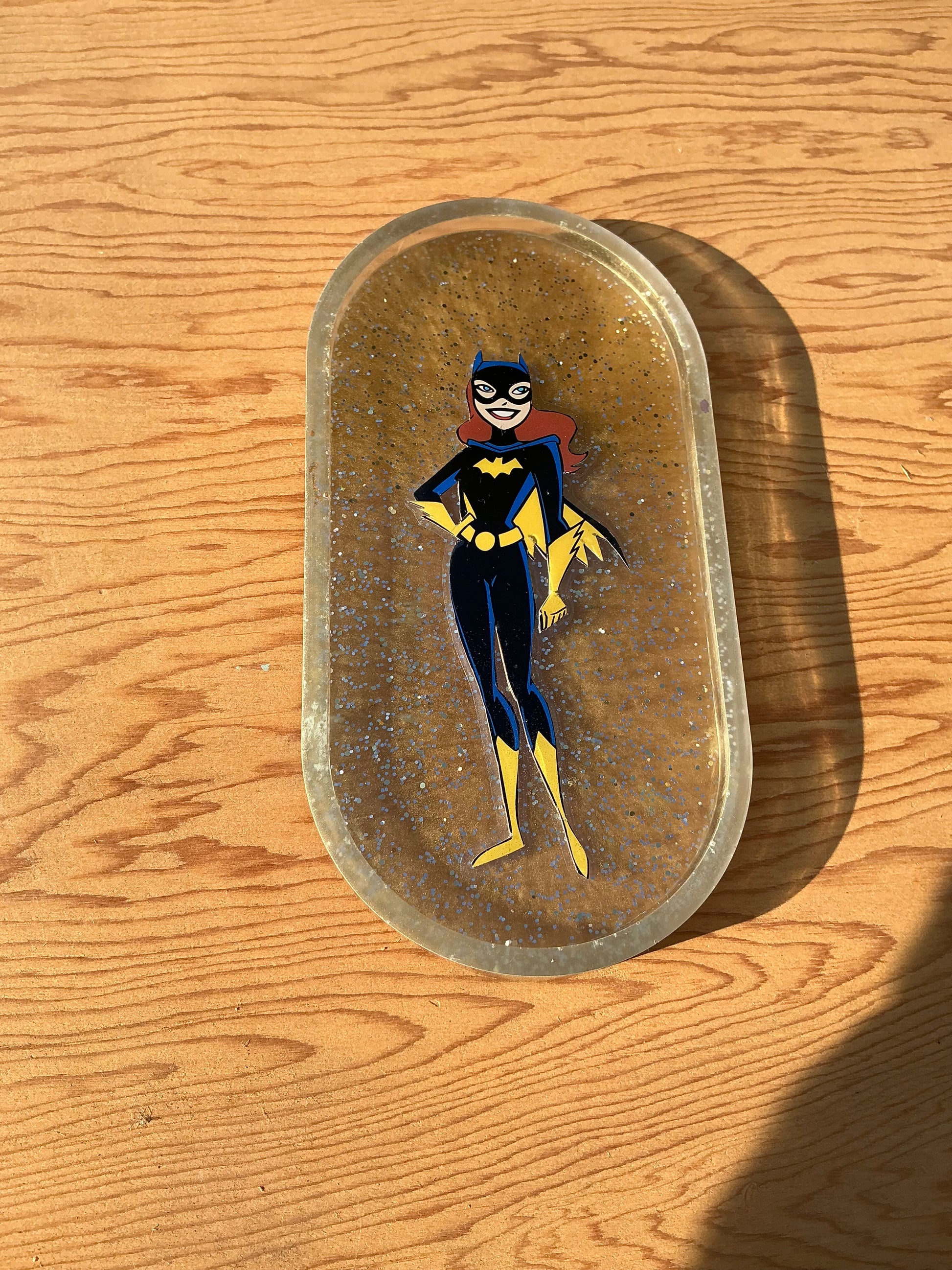 A cute little coaster/ash tray made with recycled comic book clippings and non toxic epoxy resin.
